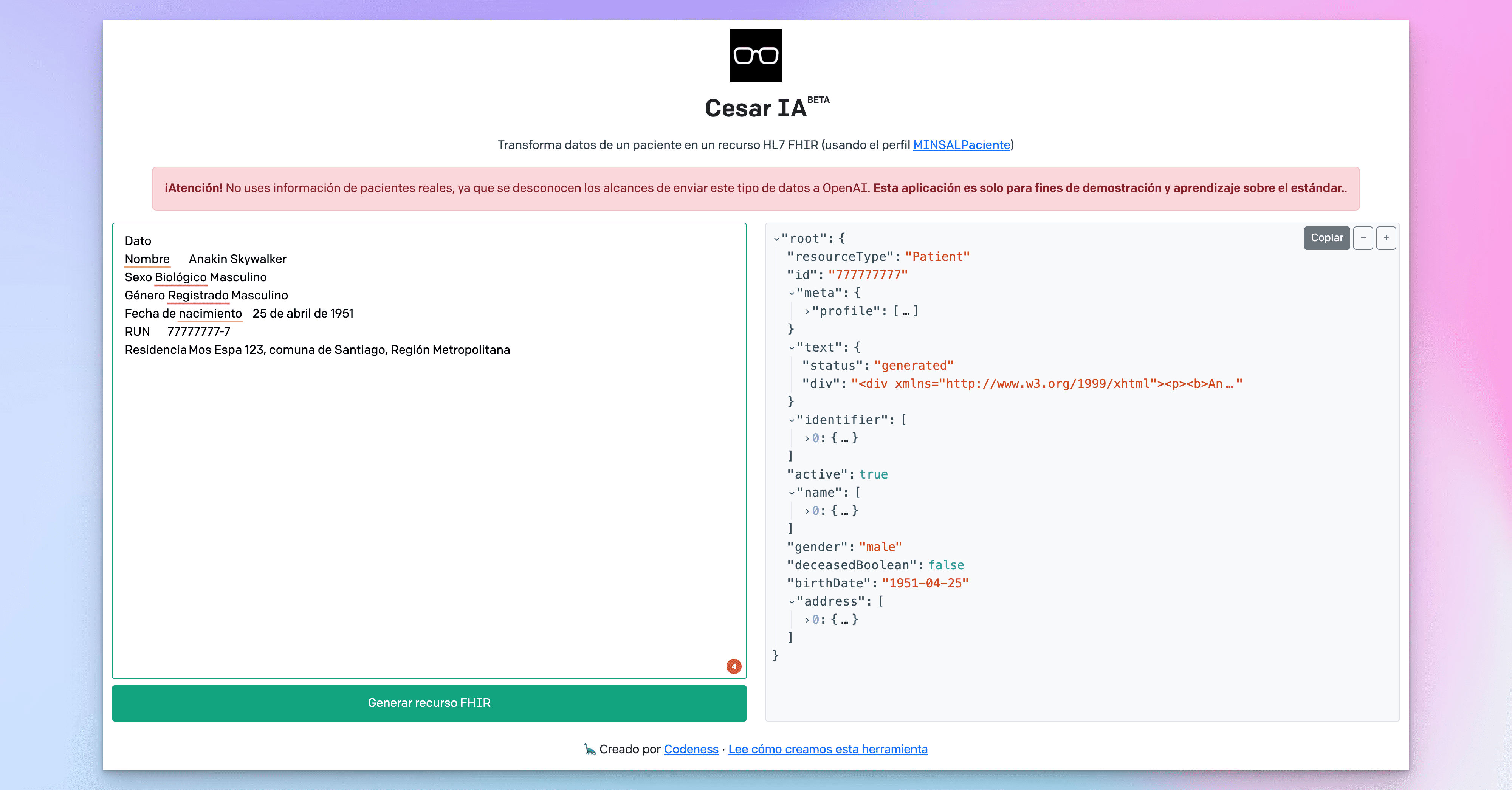 Cesar AI es una aplicación web que transforma información de un paciente (en cualquier formato) a un recurso Patient de HL7 FHIR.
