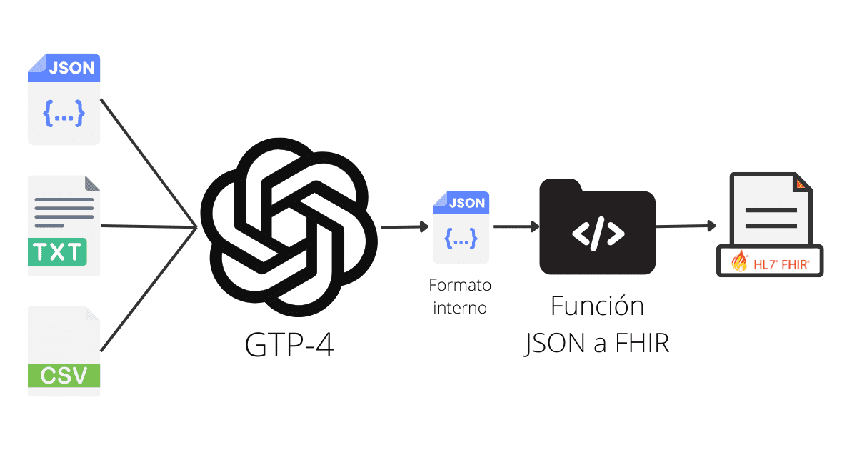 Input de usuario (csv, txt, json) → LLM → JSON (formato propio) → Código de la aplicación → FHIR